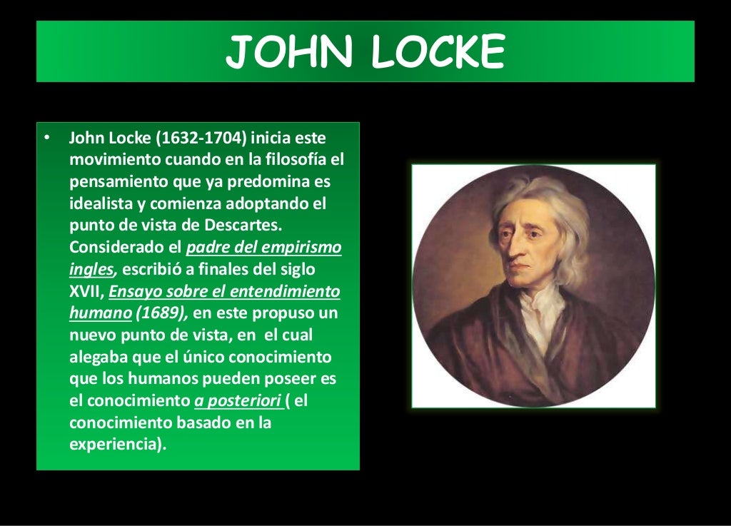 Los principales representantes del empirismo fueron: John Locke (1632-1704). Fue un filósofo y médico inglés, padre además del Liberalismo Clásico. Su obra se vio muy influenciada por los escritos de sir Francis Bacon. Su famoso Ensayo sobre el entendimiento humano de 1689 fue una réplica a René Descartes, y proponía que la mente humana.