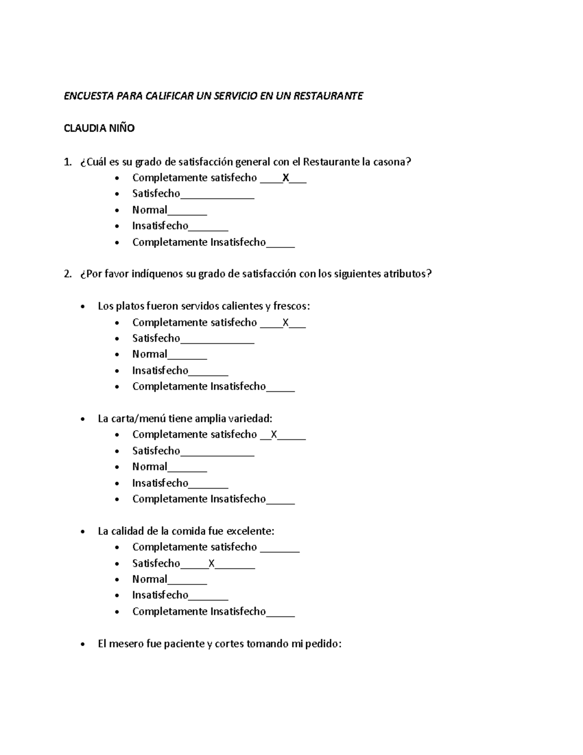 Encuesta restaurante Encuesta restaurante ENCUESTA PARA CALIFICAR UN SERVICIO EN UN