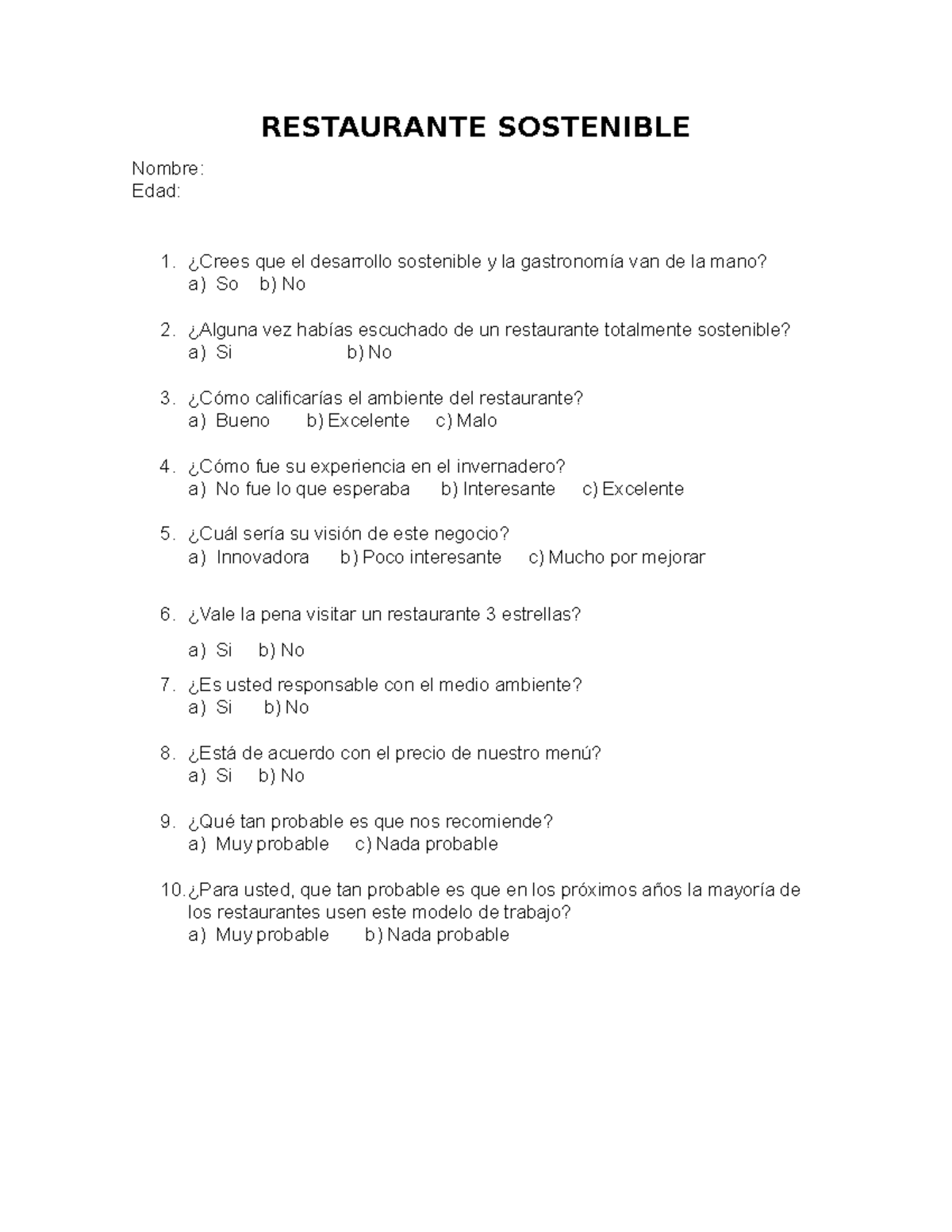 Encuesta sobre proyecto de sostenibilidad en restaurantes RESTAURANTE SOSTENIBLE Nombre Edad