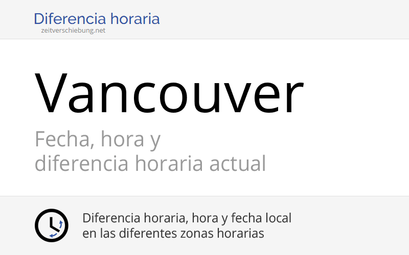 America/Vancouver Zona horaria en Canad. Acerca de Diferencia horaria Obtener fecha y hora actual . Diferencia horaria, hora y fecha local en las diferentes zonas horarias. ¡Por y para gente como tú y yo! ¡Respuestas y herramientas que facilitan la vida!