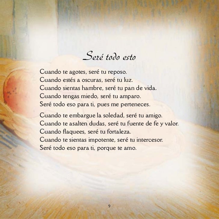 Al atardecer de la vida. me examinarán del amor. Si ofrecí mi pan al hambriento. si al sediento di de beber. si mis manos fueron sus manos. si en mi hogar le quise acoger. Si ayude a los necesitados. si en el pobre he visto al señor. si los tristes y los enfermos.