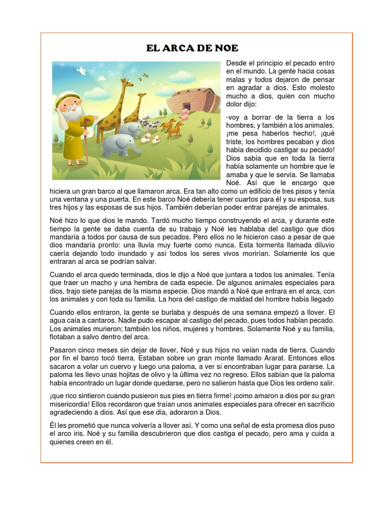 Historia del Arca de Noé. Según nos cuenta la historia, los descendientes de Adán y Eva se habían vuelto malvados, y Dios se arrepentía de haber creado a la humanidad. Por esta razón, decidió que debía de destruirlos a todos y empezar de nuevo. Pero había un hombre, Noé, que siempre había obedecido a Dios y por esto había ganado el.