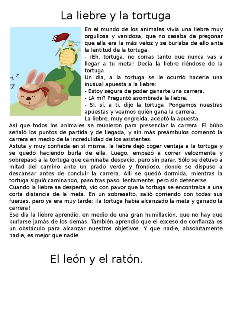 Read the classic fable of the hare and the tortoise in Spanish and learn the moral lesson of the story. Download the PDF file from Google Drive.