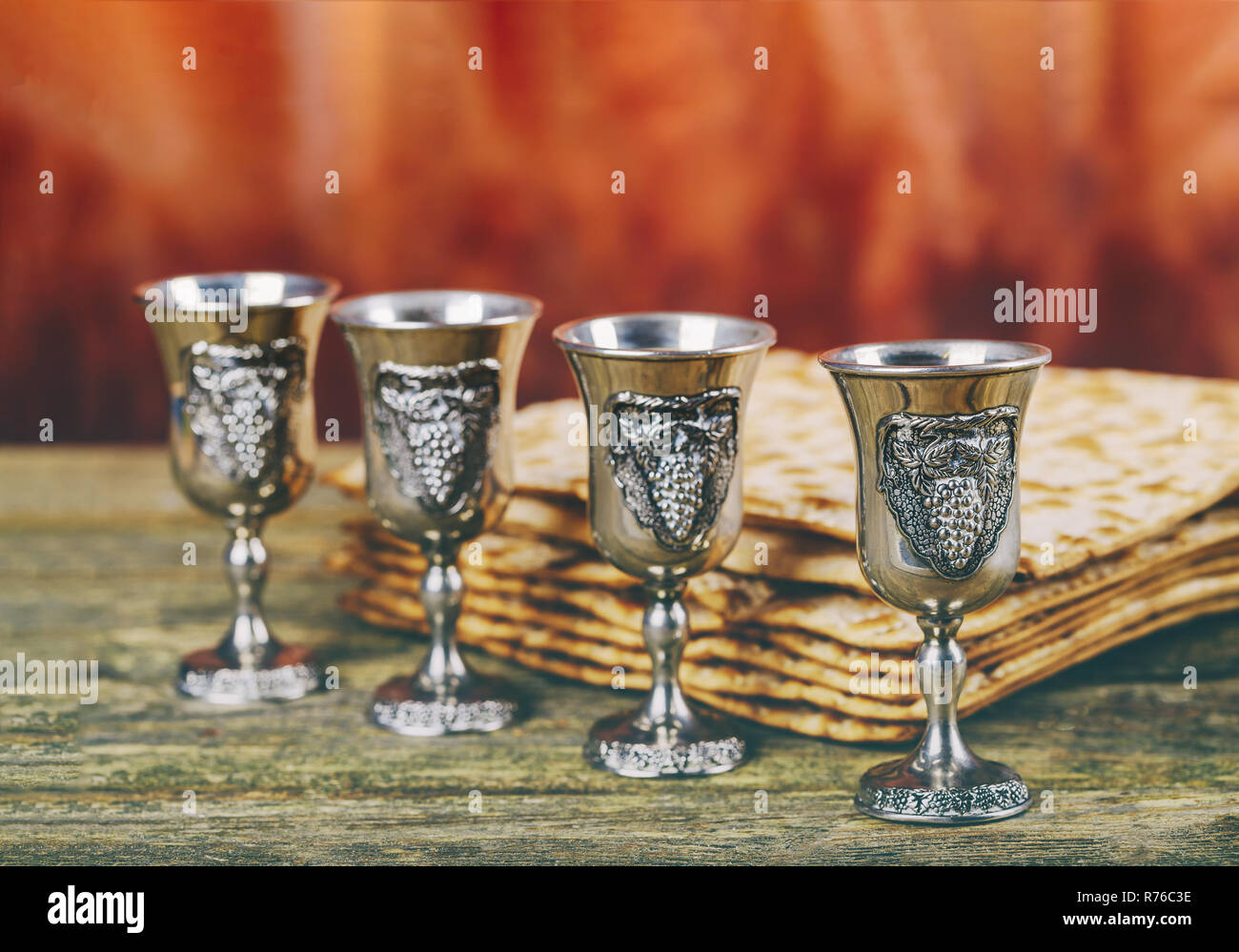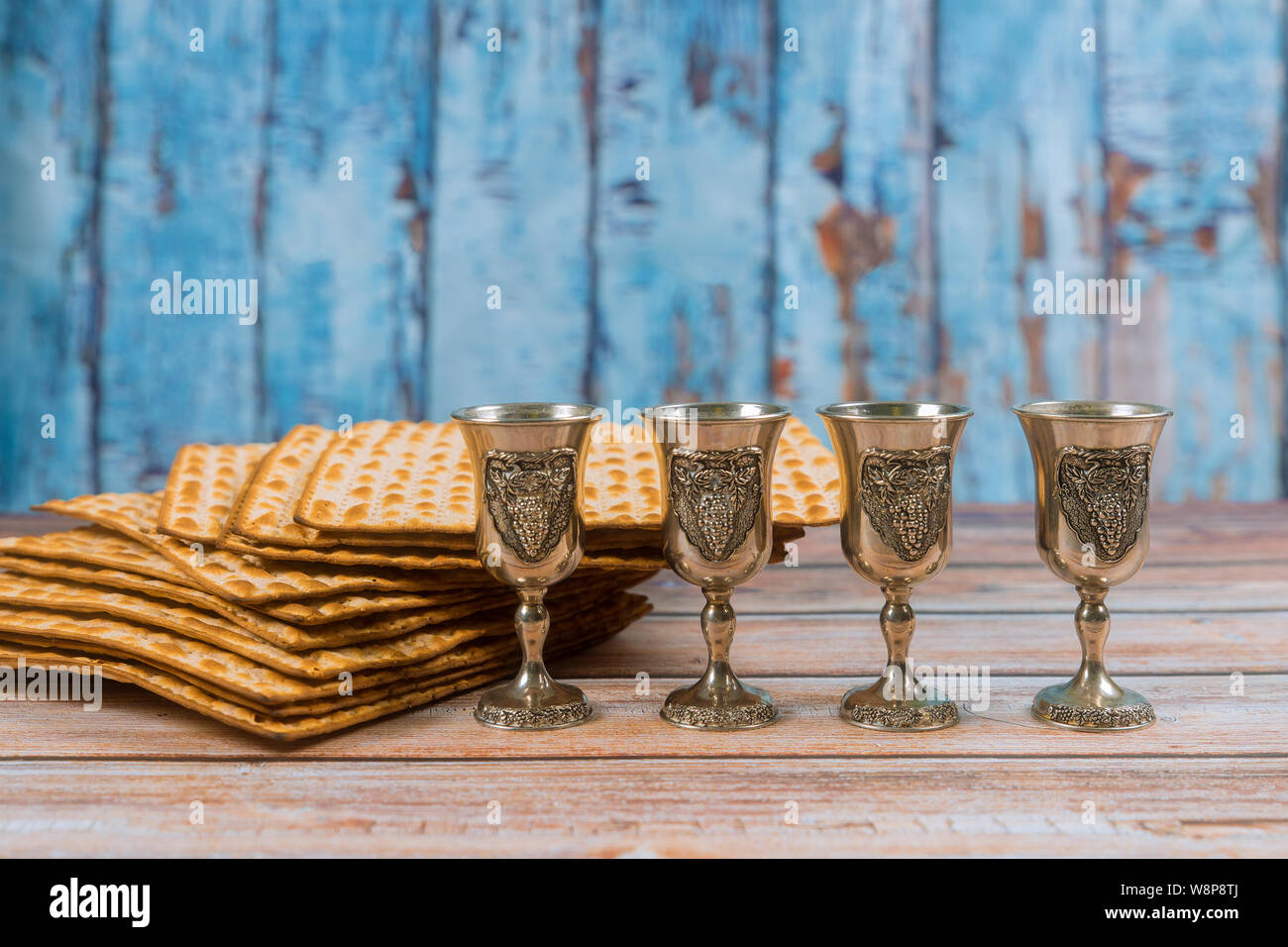 Los símbolos de la Pascua antecedentes cuatro copas de vino y pan matzoh fiesta judía sobre la