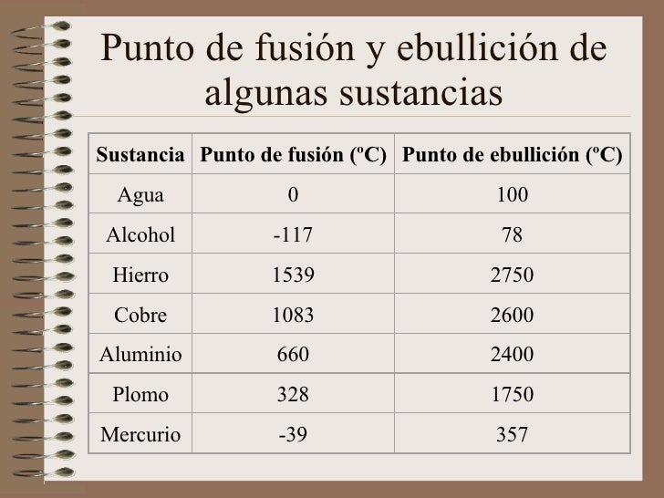 Los puntos de fusión y de ebullición son dos constantes físicas muy usadas y pedidas en los cursos de Química y Física. Punto de Fusión: Es la temperatura en la cual se verifica el cambio de estado físico de solido a liquido. Por ejemplo el hielo que se derrite y se transforma en agua líquida a 0°C a una atmósfera o 760 mm de Hg.