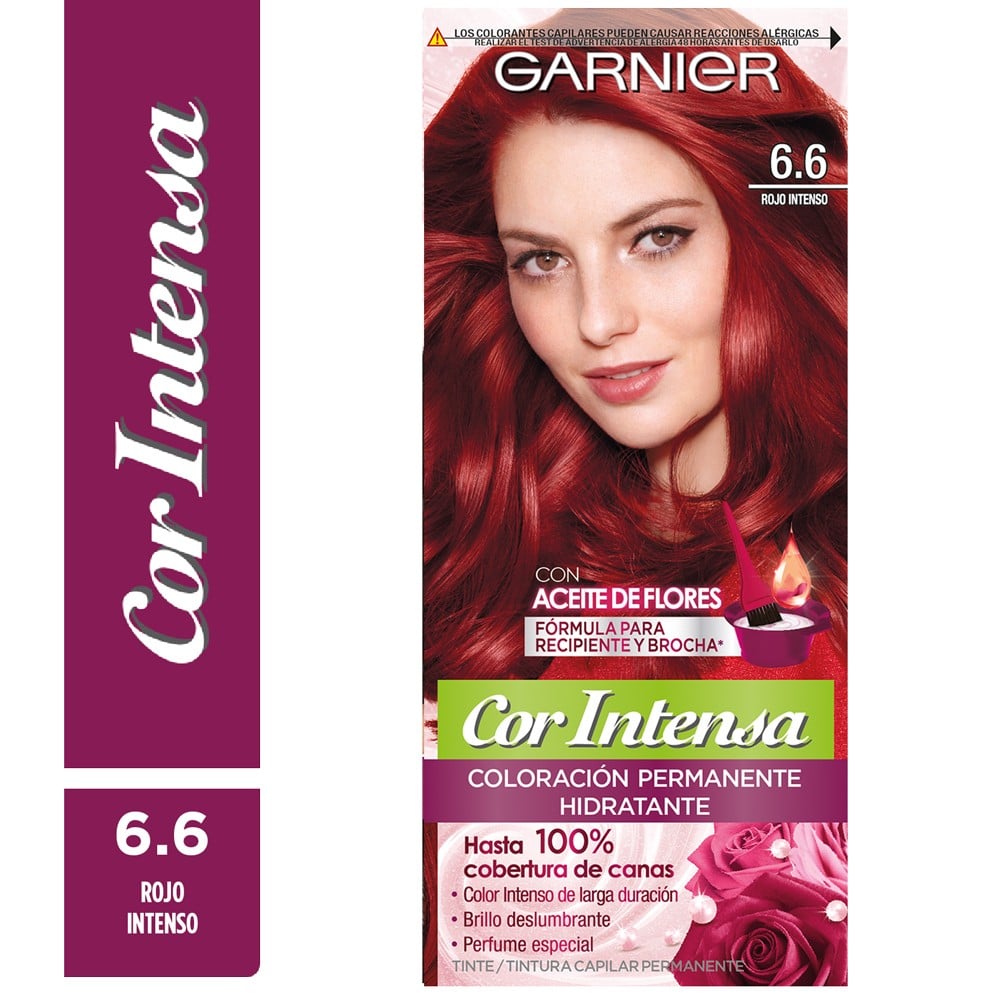 Tintura de pelo. ¡Qué mal! Justo se agotó. GARNIER. Tinte Cor Intensa 6.6 Rojo Intenso Garnier. $ 6.990. Vendido por cosmetic. Especificaciones. Información adicional. La fórmula hidratante de Cor Intensa garantiza la máxima hidratación y un color perfecto. Con textura cremosa y aroma floral, su aplicación es fácil y agradable. *Tinte Permanente*